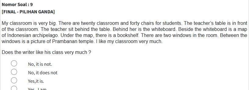 I'll attach screen shot taken from an online assessment developed/written by a (supposedly) well-respected school in West Java. I can assure you that this question was typical of the assessment...my kids and I didn't know whether to howl with laughter or bang our heads on the wall at such rubbish.View attachment 4818