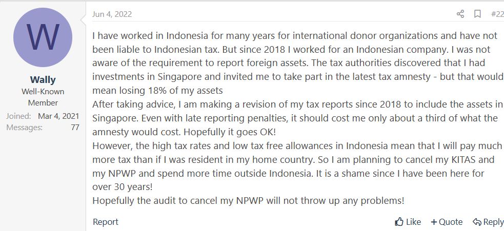 Repeating : we foreigners domestic/resident taxpayers in Indonesia are subjected to income tax on worldwide income(s) , according to the Law . But it seems this rule has not been enforced yet on foreigners neither working nor having business in Indonesia .