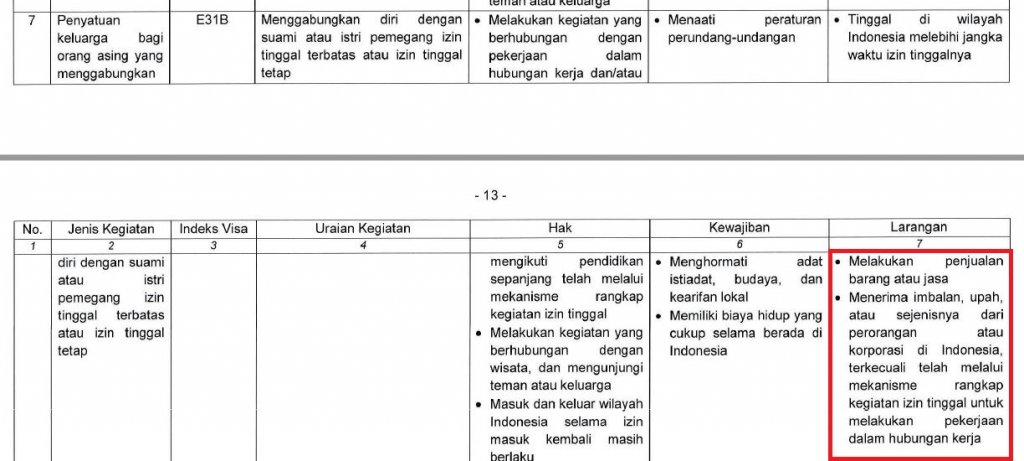 Also, the explanation of the law for Visa Clarification is provided by the Kepmenkumham No. M.HH-01.GR.01.04 of 2023. It is itemized what each type of visa can and cannot do. It is clearly spelled out no ambiguity here that: for spouse sponsored VISA, It is forbidden to