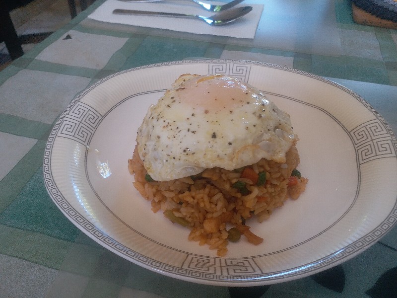 Chicken fried rice (or Nasi Goreng as it is called here). Made on this base paste, and adding mixed vegetable and chicken. Usually I use bacon, it's more tasty than chicken which is very bland. I like it with a fried egg on top, a liquid one not dry cardboard as they usually fry them in Asia...