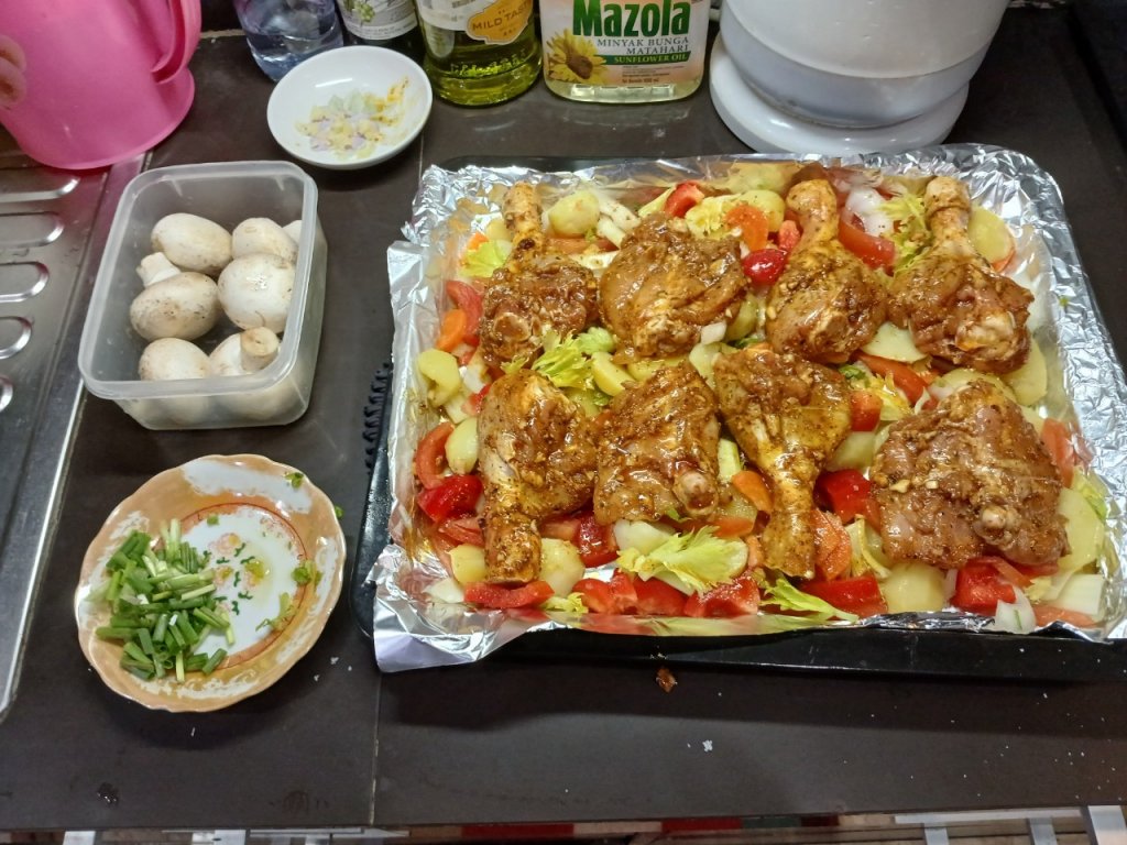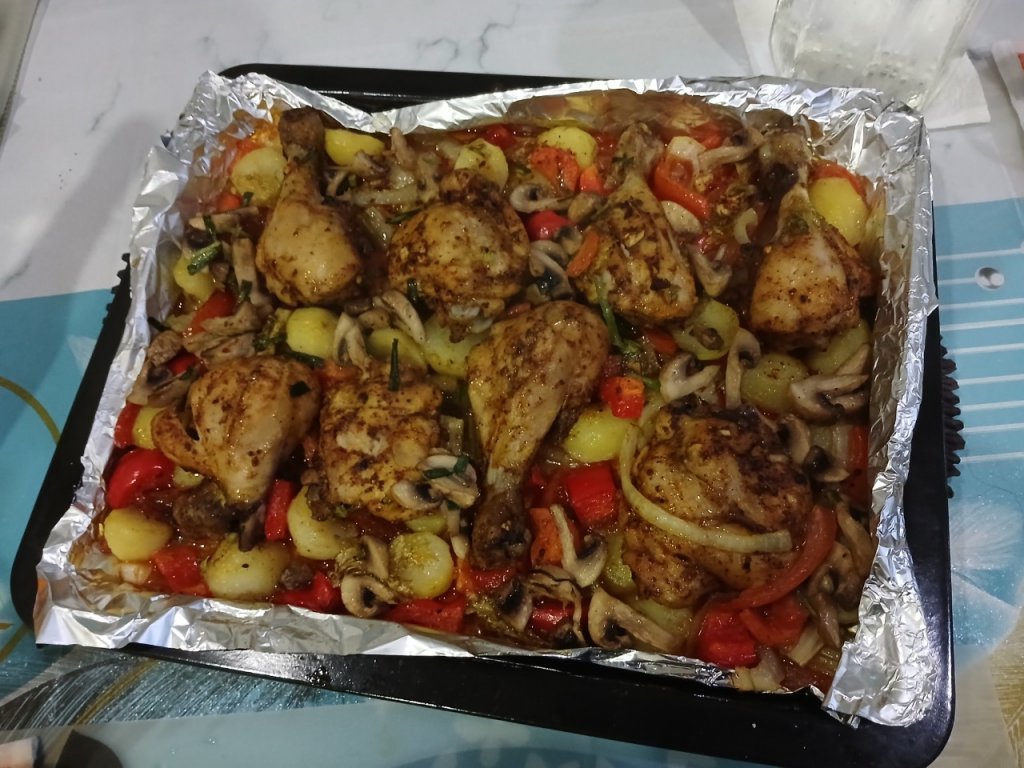 Chicken and vegetables in the oven yesterday dinner.