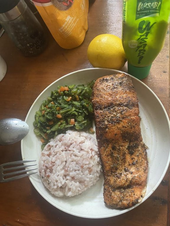 Seared Salmon fillet, in Olive Oil, Stir fried Vegetables. And Red Rice. With Lemon, Dill, Black Pepper, Salt, and Wasabi for added flavors!