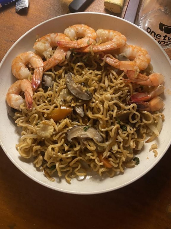 I tried to create a variety of Mei Goreng more to my taste. Instead of the usual Chicken meat, I decided to go for nice Prawns, and in the noodles, I added stir fried, baby Corn, Mushrooms, Bombay Onions, Garlic, Red Paprika, all chopped up fine, and when it was all ready, I added a drizzle of good quality Japanese Soy Sauce.It turned out quite delicious! 👍👨‍🍳